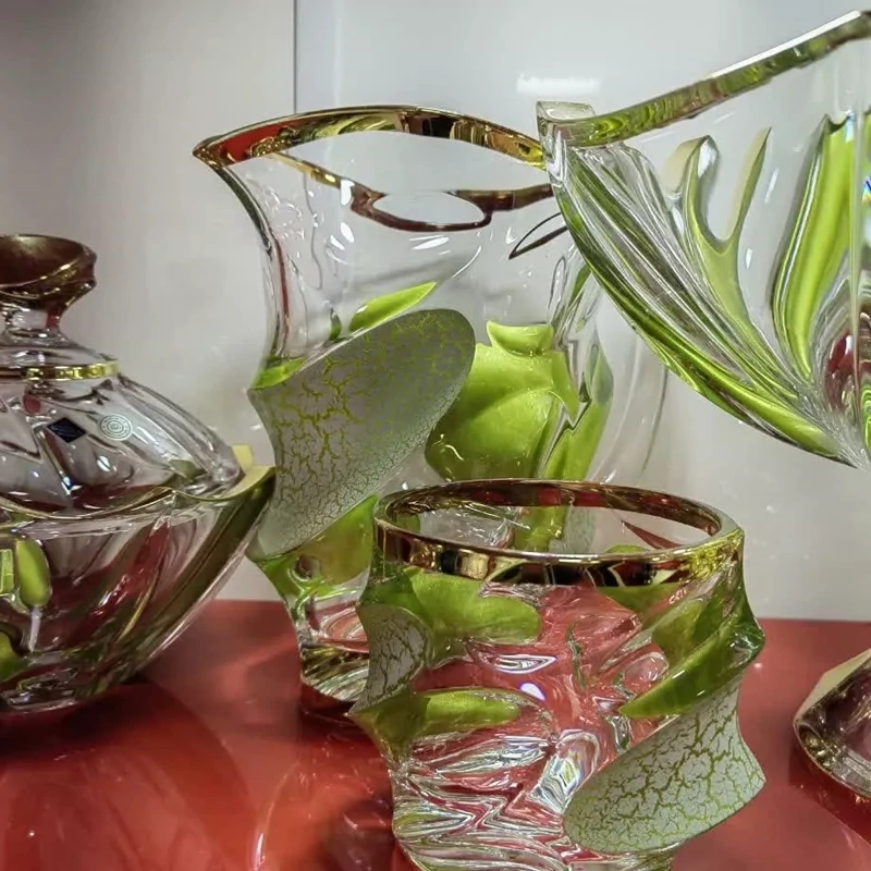 سرویس پذیرایی بوهمیا طرح کالیپسو خاص و شیک دو پوست،با رنگ سبز و طلایی شامل میوه خوری،شیرینی خوری،کاسه اجیل،پیاله و پیش دست،تنگ،پارچ و لیوان،شکلات درب دار،قندان درب دار،جا قاشقی،گلدان یک سرویس بی نظیر و اصل چک است