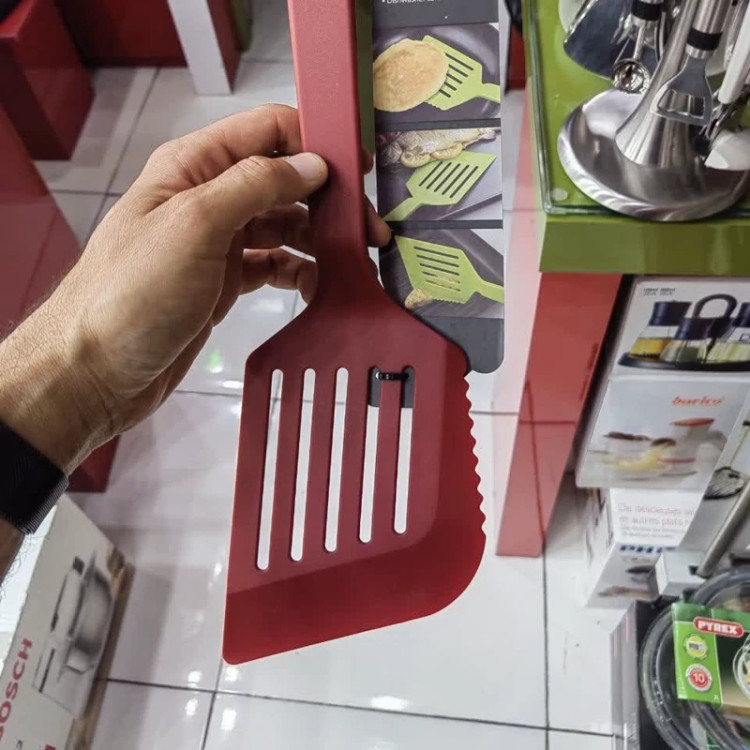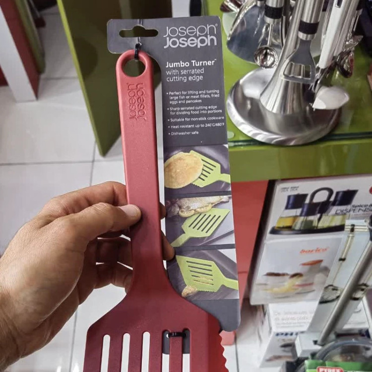 کفگیر تخت و برش دار برند ژوزف ژوزف تا 400 درجه حرارت را تحمل میکند جنس سیلیکون قابلیت تکه کردمن مواد داخل تابه را دارد سبک و راحت
