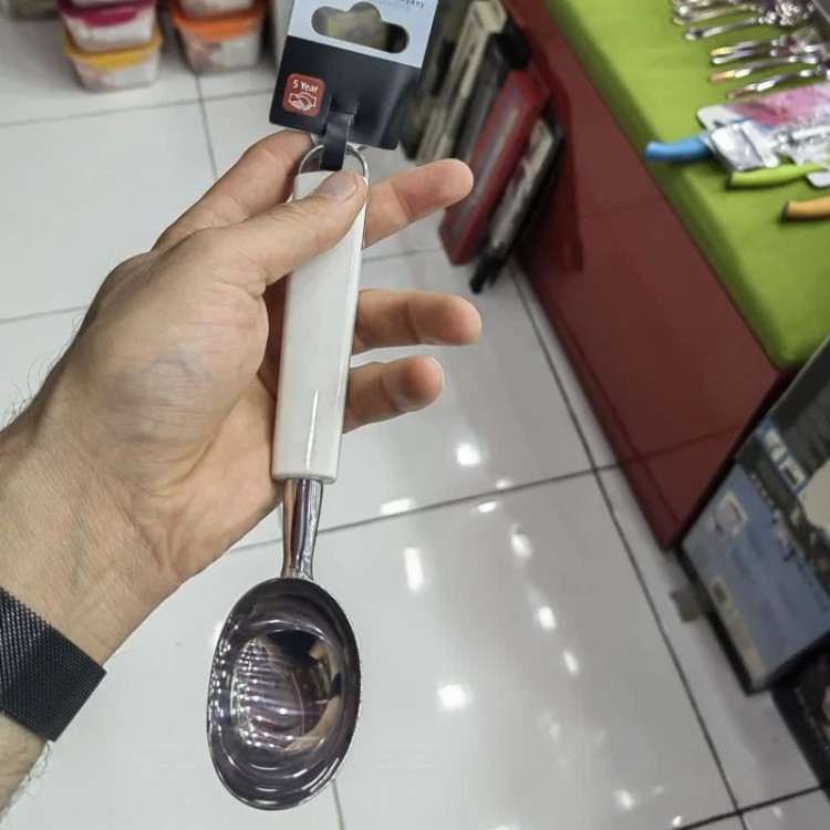 قاشق اسکوپ بستنی تا وزن 5 کیلو را تحمل میکند استیل ضدزنگ بدنه استیل رنگ سفید دارای حلقه اویز