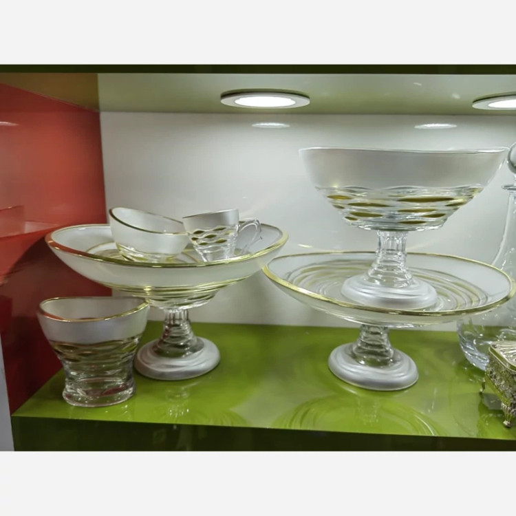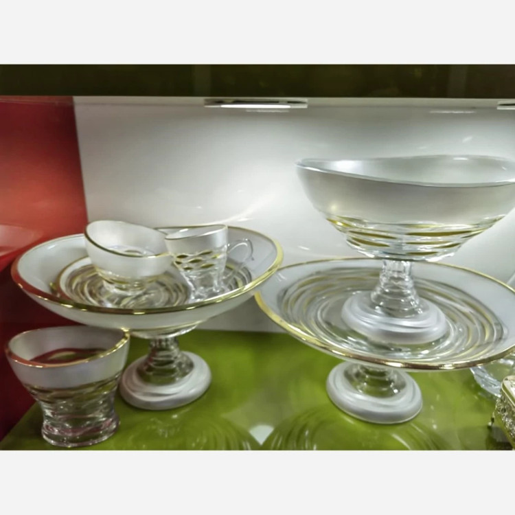 شامل فنجان 6 عدد پیاله 6 عدد پیش دست 6 عدد جاکاردی1 عدد میوه خوری پایه دار شیرینی خوری پایه دار کاسه آجیل پایه دار
