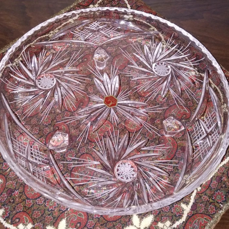 سینی سه پایه گرد کریستال jcc پرتراش و زیبا تراش خورشیدی شفاف مناسب برای شیرینی و چای هنر دست مردمان ایران زمین کریستال 24 درصد