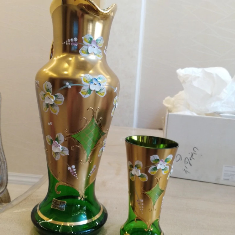 پارچ و لیوان اگرمن رنگ سبز شامل یک پارچ و 6 لیوان پر گل و طلاکوب ساخت کشور چک