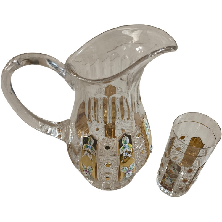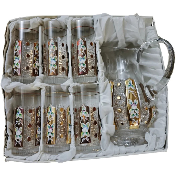 ست پارچ و لیوان بلند بوهمیا کریستال طلایی گل دار